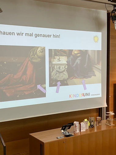 18.6.2025 – Die Kinderuni an der FH Vorarlberg ist ein spannendes Forum für junge Forscher:innen. Auf Einladung durfte MINT-Koordinatorin Andrea Huber eine Vorlesung zum Thema Leonardo da Vinci halten. Gemeinsam beamten sich die Kinder in die frühe Renaissance-Zeit, lernten die Mode und Bräuche der damaligen Zeit kennen. Das Leben des Universalgenie und seine besonderen Werke waren ebenso ein Thema wie die Erfindungen, die auch in unserem Leben noch relevant sind. Vom Luftsack (Airbag) bis zur modernen Kanalisation, von der Taucherglocke zum Fluggerät wurde der Bogen gespannt. Einige Modell brachten die Technik auch anschaulich näher.